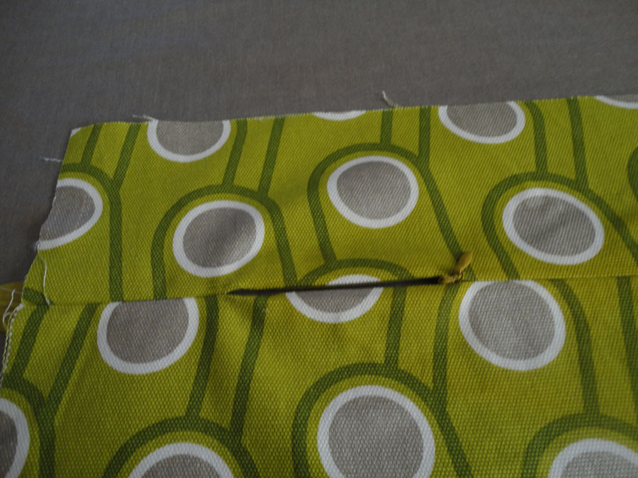 When you start to sew the zipper down, make sure you are only sewing on the seam allowance, fold the inset or back piece to the other side. You will want to start sewing the zipper higher than where you stopped the closed seam. For a less bulkier side seam, I chose to leave the first inch of the top and bottom of the zipper free, so I started sewing about an inch in from the side seam (stop the same distance on the other end).